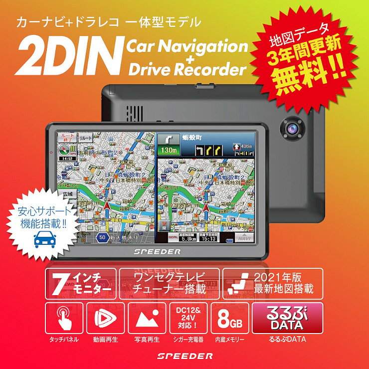 商品名 カーナビ 7インチ ドライブレコーダー内蔵 地デジ ポータブルナビ 商品情報 ● より使いやすく、よりクールなデザインを実現 ● ドライブレコーダー機能搭載 ● 角度可変型カメラ ● 地デジチューナー内蔵 ● 便利で使いやすいGPSナビゲーション機能を搭載 ● タッチパネル簡単操作 ● 3年間地図更新無料 ● るるぶデータ正規版地図搭載 【検索事項】 住所検索:32,991,451件 電話番号検索:5,491,015件 名称検索:654,356件 駅名・IC検索:18,296件 ※空港(133)、駅(15609)、IC(2554) 周辺施設検索:635,010件 るるぶDATA検索:60,461件 ※観光(44,305)、宿泊(14,481)、温泉(1,675) るるぶDATA検索(画像付):44,898件※観光(36,892)、宿泊(6,344)、温泉(1,662) オービスデータ:1,109件 【注意事項】 ※ フロント/運転席/助手席に、熱線反射ガラスや断熱ガラス、電波不透過ガラスなどの電波を通さないガラスを使用している場合、GPS受信感度が極端に低下し、十分な性能が発揮できない場合があります。